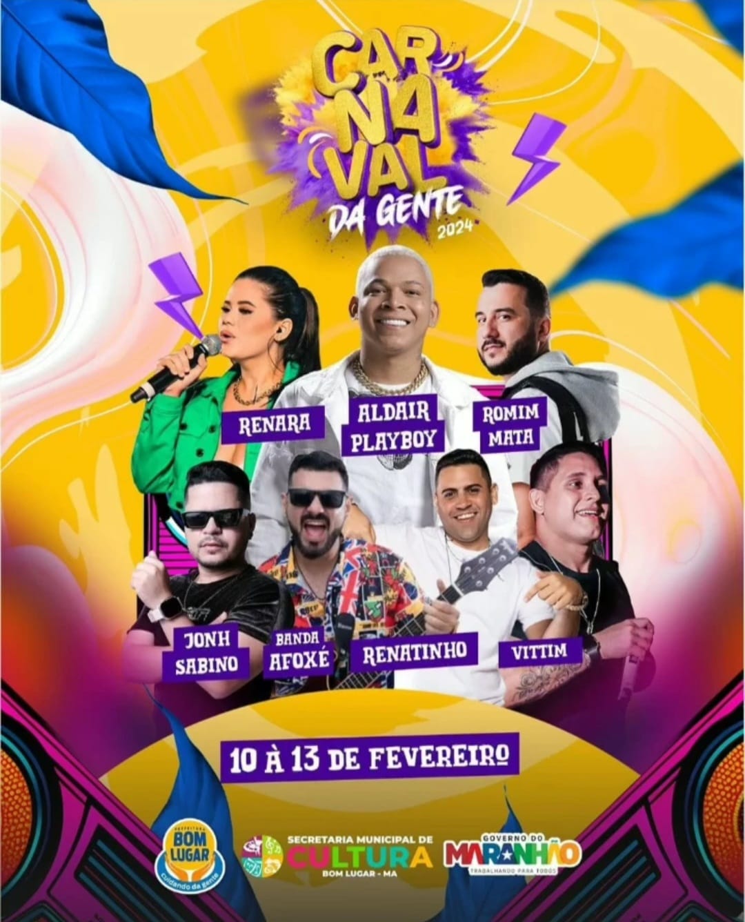 A partir de sábado, dia 10 de fevereiro, o público poderá desfrutar de apresentações com: John Sabino, Banda Afoxé, Renatinho, Vittim, Renara, Romim Mata e Aldair Playboy. A diversão está garantida até a terça-feira, dia 13 de fevereiro, com muita alegria e folia em Bom Lugar.