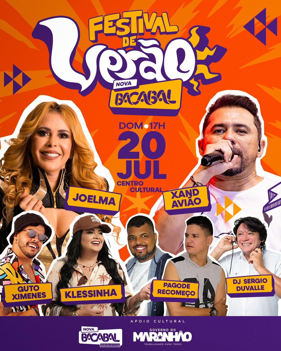 A programação inclui atrações como DJ Sérgio Duvalle, Pagode Recomeço, Klessinha, Guto Ximenes, Xand Avião e Joelma. A expectativa é de grande público, com moradores de Bacabal e de municípios vizinhos da região do Mearim.