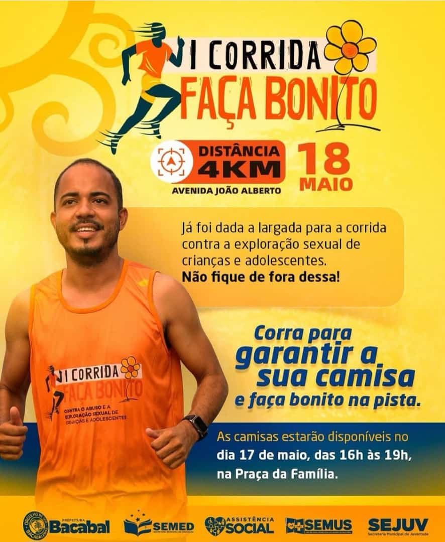 Realização: A 1ª Corrida Faça Bonito é uma realização da Prefeitura de Bacabal, por meio das secretarias de Educação, Saúde, Assistência Social e Juventude.