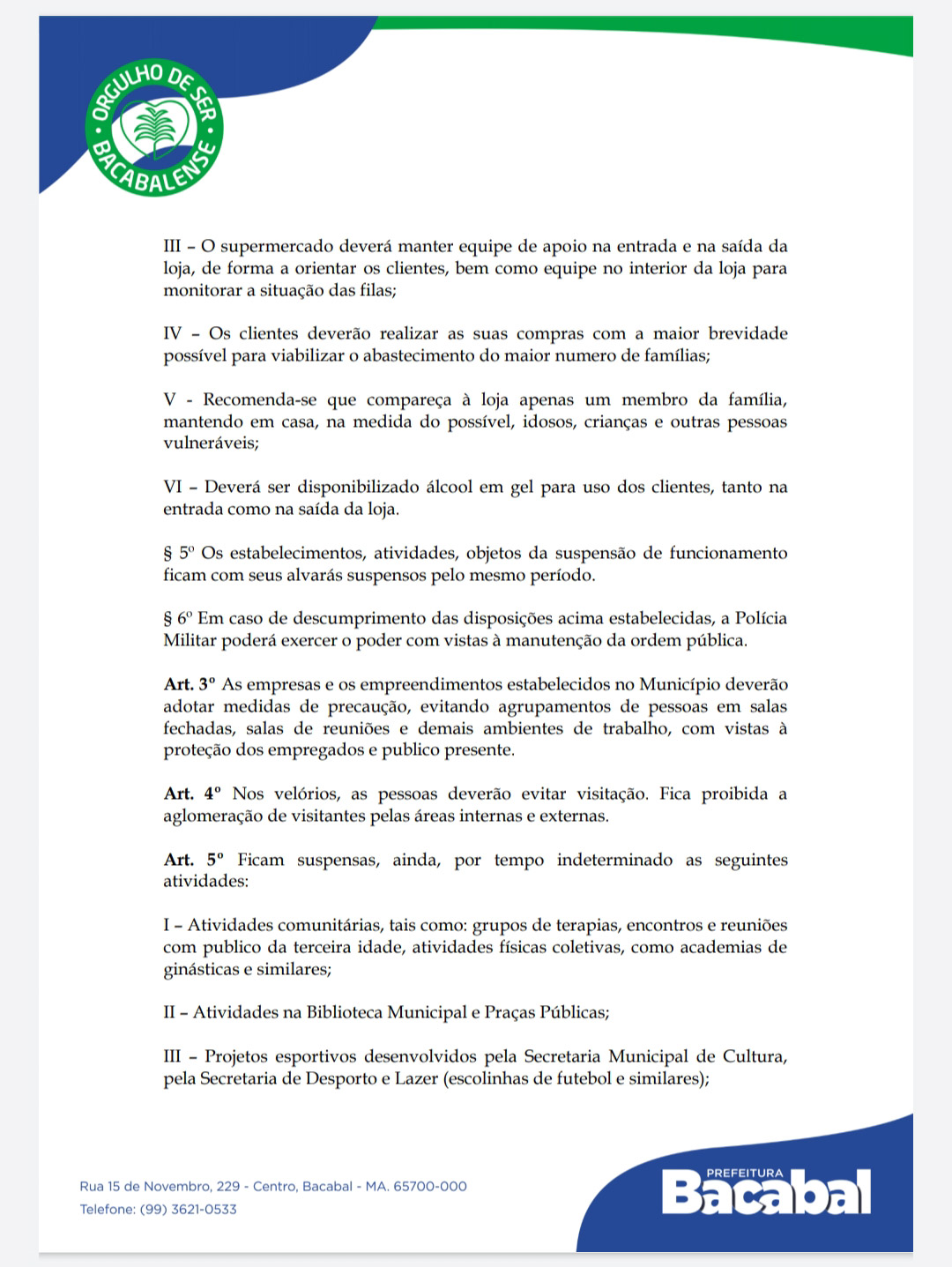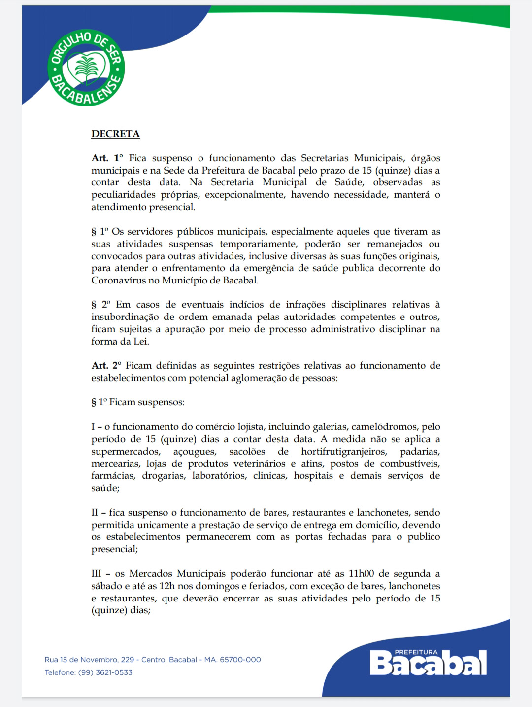 Novo Decreto da Prefeitura de Bacabal suspende atendimento nas secretarias municipais, funcionamento do comércio lojista, bares e restaurantes, além de determinar outras normas