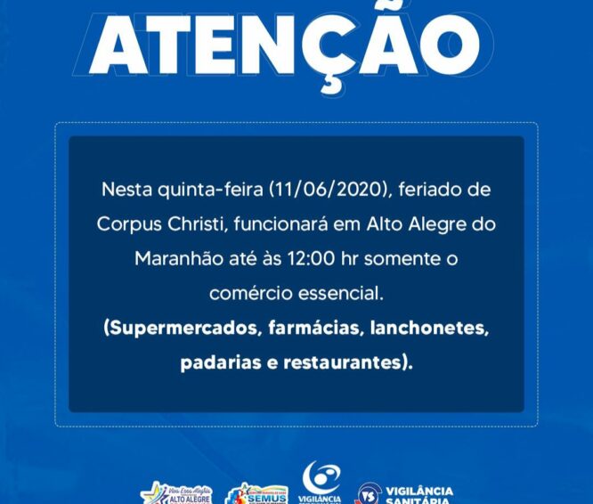 PREFEITURA DE ALTO ALEGRE DO MA, AVISA QUE NESTA QUINTA FEIRA FERIADO DE CORPUS CRISTI O COMERCIO ESSENCIAL ESTARÁ FUNCIONANDO ATE O MEIO DIA