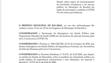 PREFEITO EDVAN BRANDÃO DECRETA A LIBERAÇÃO PARCIALMENTE DAS ATIVIDADES COMERCIAIS DE BACABAL