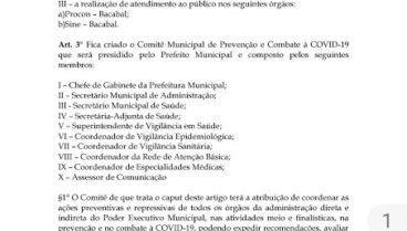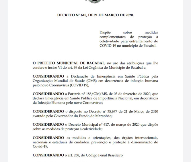 Novo Decreto da Prefeitura de Bacabal suspende atendimento nas secretarias municipais, funcionamento do comércio lojista, bares e restaurantes, além de determinar outras normas