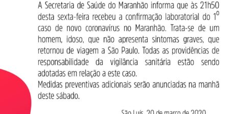 ESTADO DO MARANHÃO REGISTRA PRIMEIRO CASO DE CORONAVIRUS