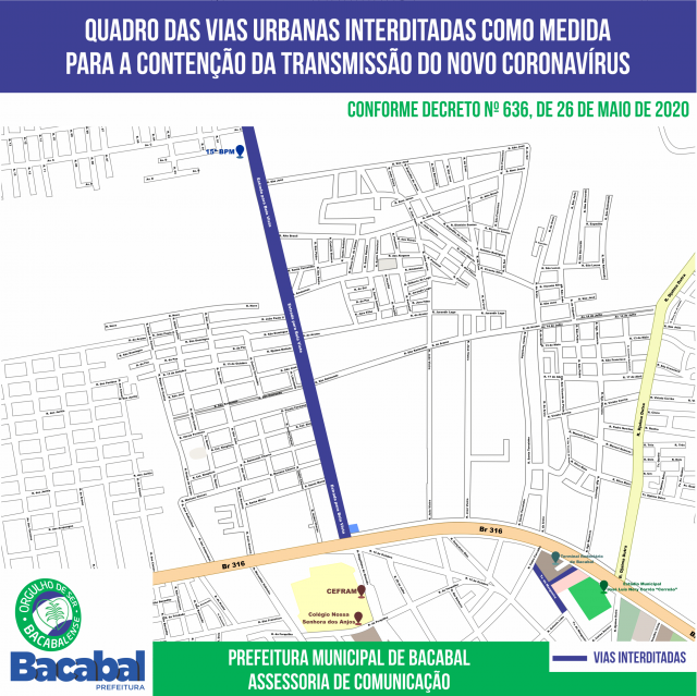 A Estrada da Bela Vista, via que liga vários bairros ao centro de Bacabal, também será interditada, podendo passar pelas barreiras somente as pessoas que comprovarem que realmente estão a caminho do trabalho ou em busca de atendimento médico ou para a compra de medicamentos. O decreto municipal traz o modelo de declaração a ser preenchido e assinado pelos empregadores.