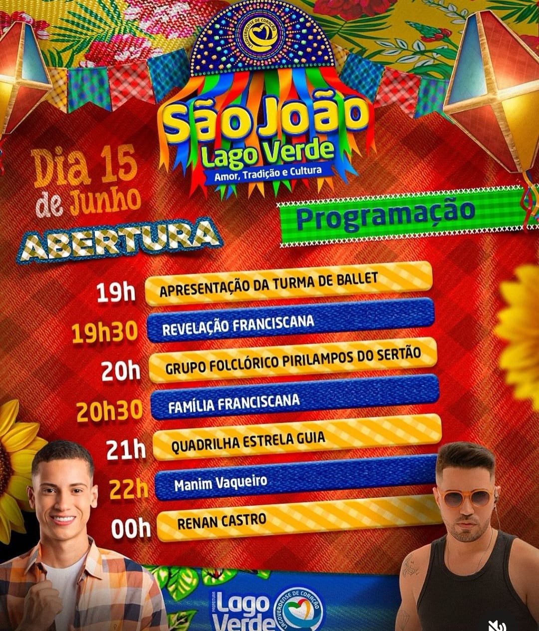 A prefeitura de Lago Verde, sob a gestão do prefeito Alex Almeida, mantendo a tradição junina de realizar um São João Gigante, já anunciou as atrações do São João 2024. O evento começa hoje, sábado, 15 de junho, e se estenderá até o dia 07 de julho, com uma vasta programação tanto na sede quanto na zona rural.